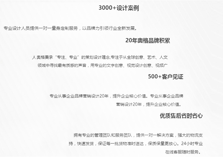 2000ÄêÖÁ½ñ£¬°Â¸ñרעÓÚΪÆóÒµÌá¹©Æ·ÅÆ»ù´¡ÏµÍ³´´½¨¡¢Æ·Åưü×°¸üÐÂÉý¼¶¡¢Æ·ÅÆÊÓ¾õ´«´ïϵͳµÈ¶àÏîÉè¼Æ·þÎñ£¬°Â¸ñÒѾ­·¢Õ¹³ÉÆ·ÅÆÉè¼ÆÓë¹ÜÀí¹«Ë¾£¬ÊÇÖйú´´ÒâÉè¼ÆµÄʵ¼ùÕß¡£¶àÄêÀ´£¬°Â¸ñÒÔ¹ú¼Ê»¯µÄÉè¼Æ¹ÛºÍʵÎñÔË×÷ÏíÓþÒµ½ç£¬ÂŴλñµÃ¿Í»§µÄ¿Ï¶¨ÓëºÃÆÀ¡£ÎÒÃǻ㼯ÁËÖÚ¶à²Å»ªºáÒçµÄÉè¼Æ¾«Ó¢£¬Ê¹°Â¸ñ¼æ¾ßÑϽ÷µÄ·ÖÎöÄÜÁ¦ºÍ´´ÔìÁ¦£¬ÎªÆóÒµÌṩ¶àÁìÓòµÄ´´ÒâÉè¼Æ·þÎñ¡£ÎÒÃǵijɹ¦À´Ô´ÓÚ¿Í»§µÄ³É¹¦£¬Éè¼ÆÐèÒªÒ»¸öÀí½â¡¢×ðÖØ¡¢¿íËɺͳäÂú¼¤ÇéµÄ»·¾³£¬Ö»ÓÐÇ×ÃܵĺÏ×÷»ï°é¹ØÏµ²ÅÄÜÈç´Ë¡£°Â¸ñ½«Ê¸Ö¾²»Ó壬±ü³ÐרҵÖÂÉϵÄÀíÄ°ïÖú¿Í»§¶´Ï¤Êг¡ÏÈ»ú£¬·¢Õ¹Æ·ÅÆ×ʲú£¬³É¾ÍËû´´Ôì¼ÛÖµ¡£